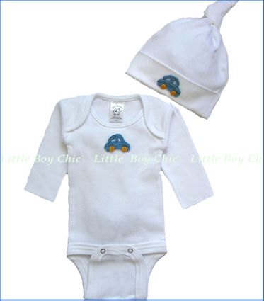 This adorable long-sleeve bodysuit with a crochet applique comes with a matching knotted cap. The exquisite two-color crochet makes a perfect baby shower gift! Complete the look with matching sweat pants in navy or denim. Made of high quality 100% interlock cotton and cut generously to allow for one-inch shrinkage in length.